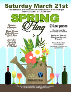 Consider this a “save the date” announcement to mark your calendars for Saturday March 21, 2026 from 4:30 to 6:30pm for the always fun and delicious AAUW SEV Annual Fundraiser Happy Hour! The event will be held in the Cottonwood San Tan Ballroom in Sun Lakes and offer multiple opportunities for everyone in the community to support our 2026 fund promoting the continued STEM education of girls and women in our community.